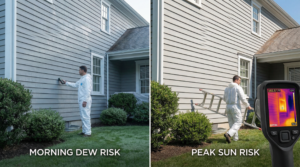 Two problems ruin otherwise “good” days: morning dew and harsh midday heat. Painting too early can trap moisture; painting on sun-baked siding can cause flash drying (skin forms before proper bonding). A practical approach is to start after surfaces dry and shift elevations based on exposure—shade sides first, then sun sides once surface temps settle. If you’re planning a pro job, the crew should manage elevation sequencing, not just “paint everything today.”
